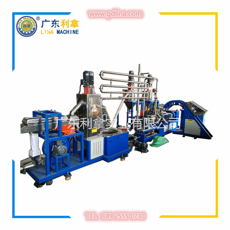 雙錐喂料機(jī)--150單螺桿擠出機(jī) -----自動(dòng)過(guò)濾換網(wǎng)器(不停機(jī))--—電磁快速保溫加熱器----開(kāi)車閥---水下切粒機(jī)——脫水分離機(jī)——分類特制振動(dòng)篩———成品粒料儲(chǔ)料筒